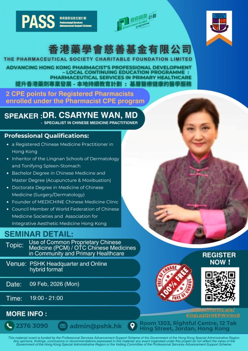 - Seminar on Use of Common Proprietary Chinese Medicine (PCM) / OTC Chinese Medicines in Community and Primary Healthcare